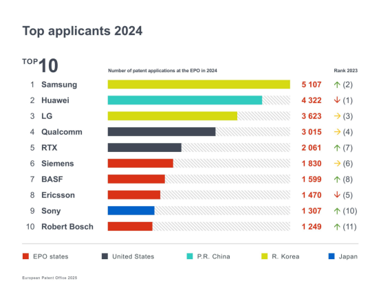 According to the EPO corporate patent application rankings for 2024, Huawei was placed second globally behind Samsung but ahead of LG, Qualcomm, and RTX. Of the top 10 companies listed by the EPO for 2024, four were from Europe while South Korea, United States, China and Japan each had two representatives occupying this list.