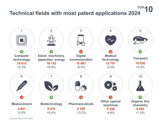 In 2024, computer technology sector patent applications reached 16,815, making it the top category worldwide at EPO for the first time ever. This field includes artificial intelligence subfields such as machine learning and pattern recognition. Meanwhile, electrical machinery, instruments, and energy sector saw impressive year-over-year growth of 8.9% due to clean energy technologies–particularly battery technology which saw its share surge 24.0% year over year.