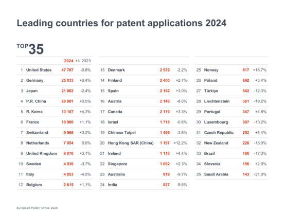 Chinese companies and researchers submitted 20,081 patent applications to the European Patent Office (EPO), setting a record and ranking fourth worldwide. The top three nations for EPO patent application submission were: USA (47787 applications), Germany (25.033), and Japan (21 062). While China experienced only 0.5% annual growth rate since 2023, its number of applications doubled since 2018 and quadrupled since 2014.